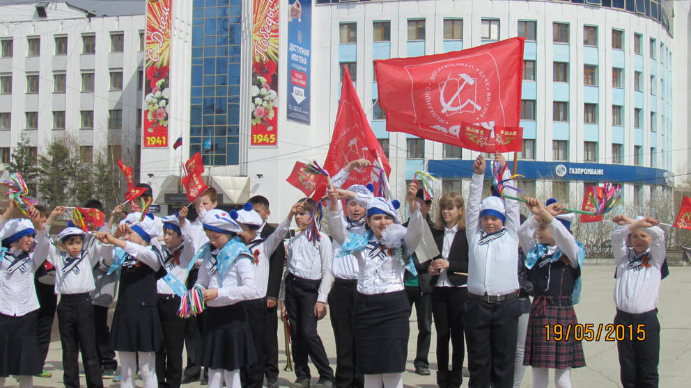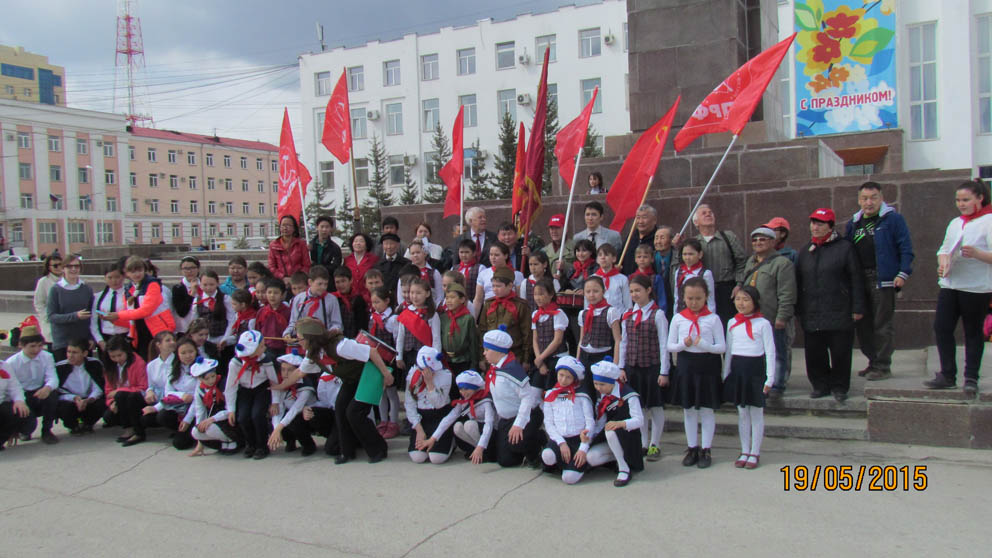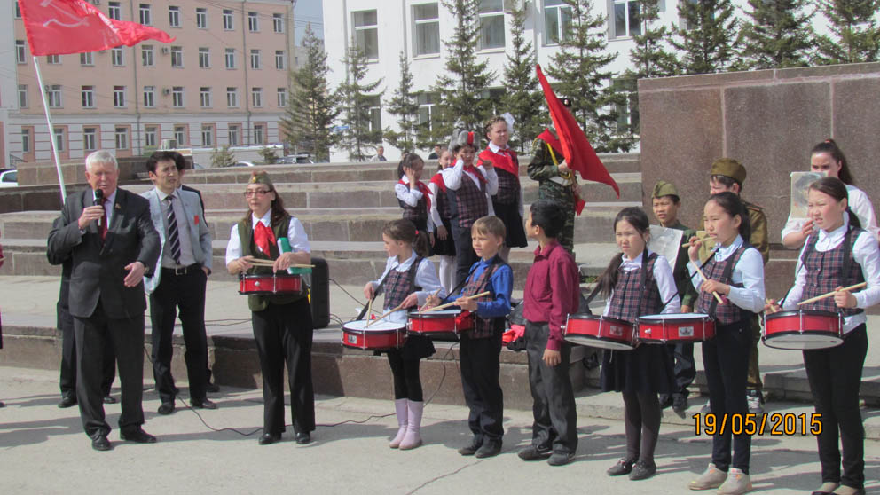 В честь 93-й годовщины Всесоюзной пионерской организации им. В.И. Ленина в Якутске на главной площади 19 мая состоялся торжественный пионерский сбор, посвященный 70-летию Великой Победы. В этот солнечный день пятьдесят мальчишек и девчонок надели красные галстуки.