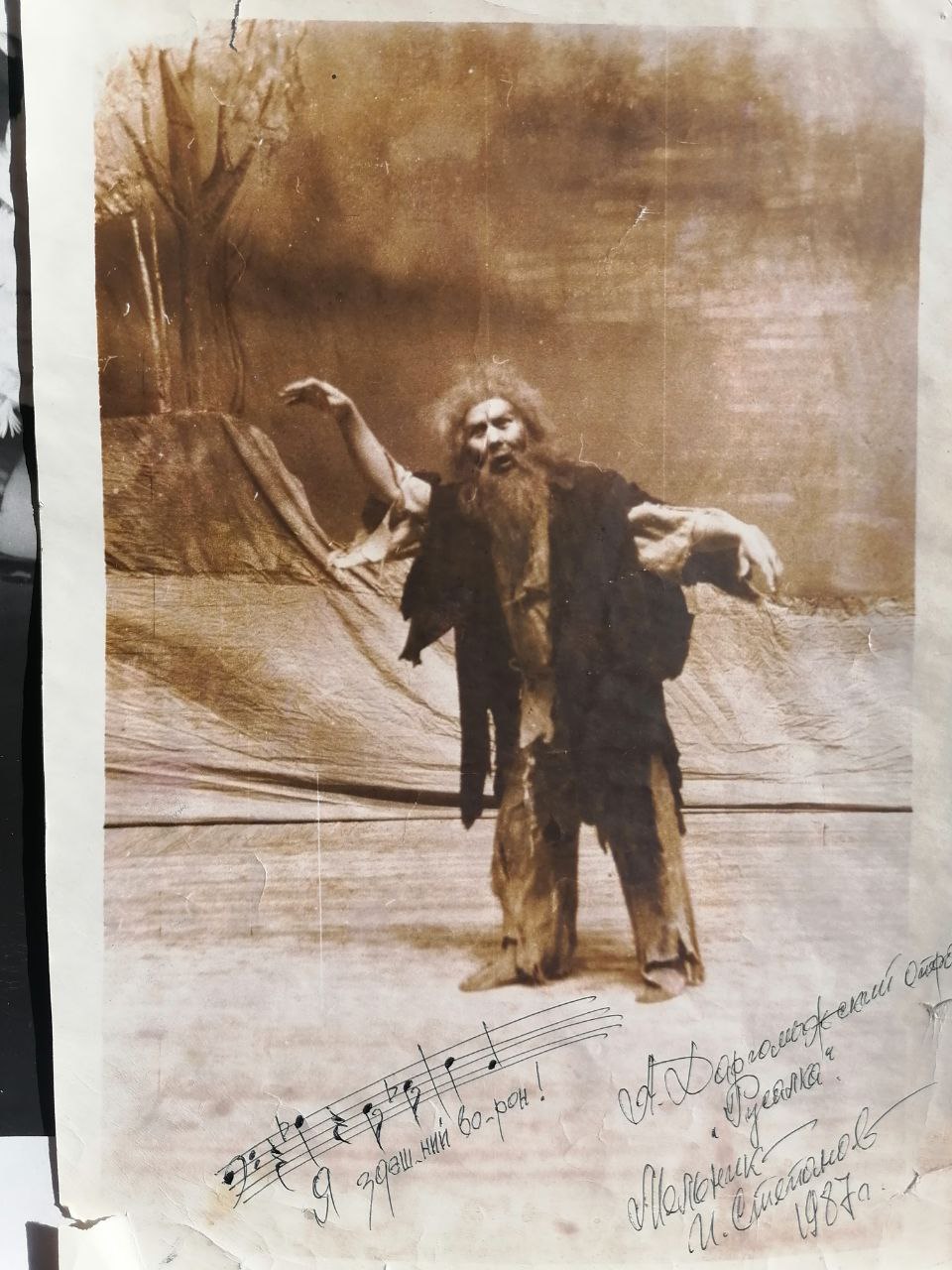 — Одним из первых моих гримов был Мельник в опере «Русалка», сцена сумасшествия. Вот он, Вороном летает. Вот это мой рисунок, всё написано тут. Помню, костюма на выпускном экзамене не было в консерватории, так мы одолжили театральный... И костюма Князя не было, тоже одалживали. Эти сложные партии, басовые, я пел на одни «пятерки».