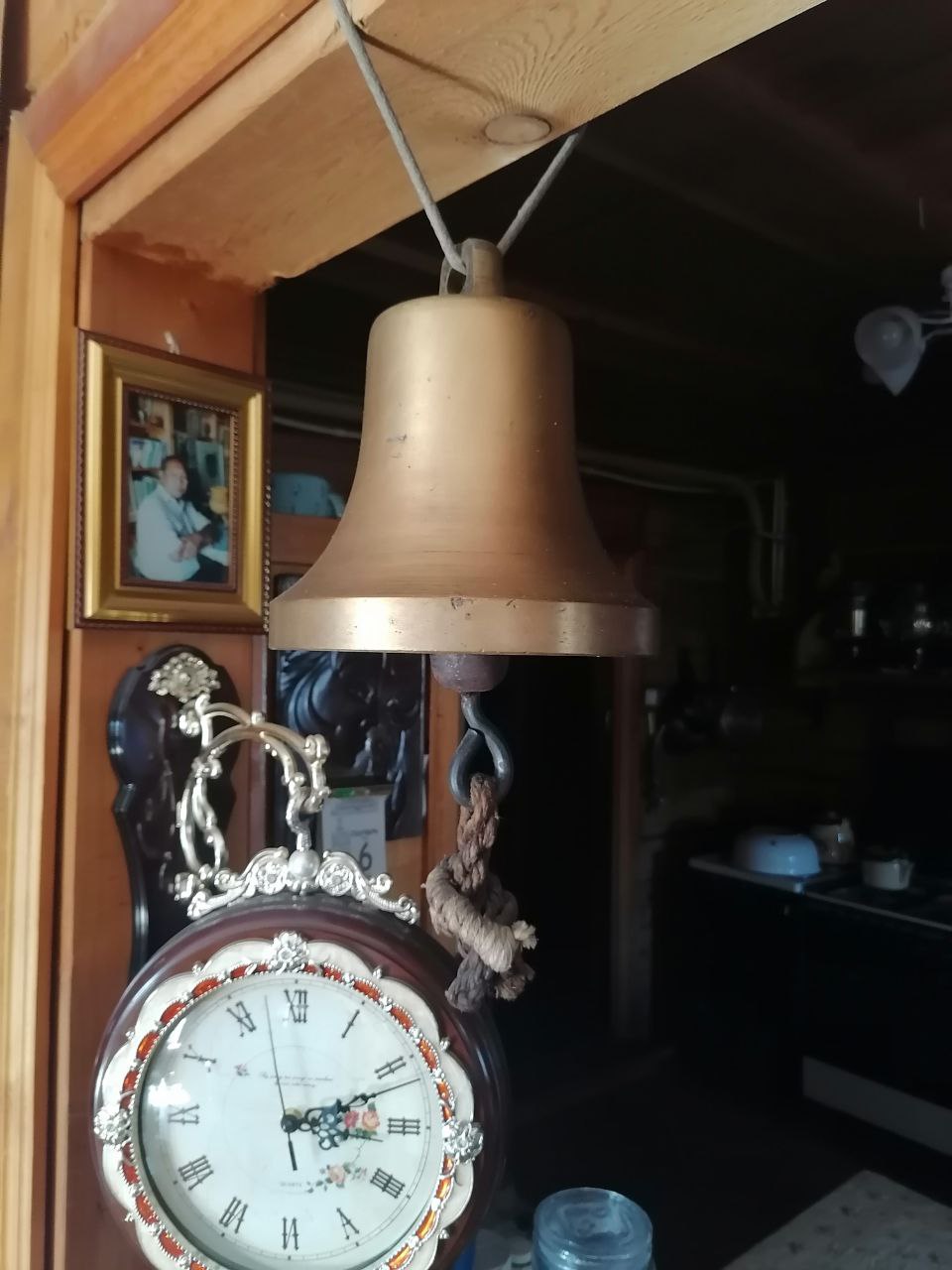 В шкафу за стеклом хранится большая коллекция колокольчиков, которые дарили ему друзья, дети, самый привозил из-за границы, а самый большой — флотская рында — под потолком. Можно качнуть и услышать звон. Дон!